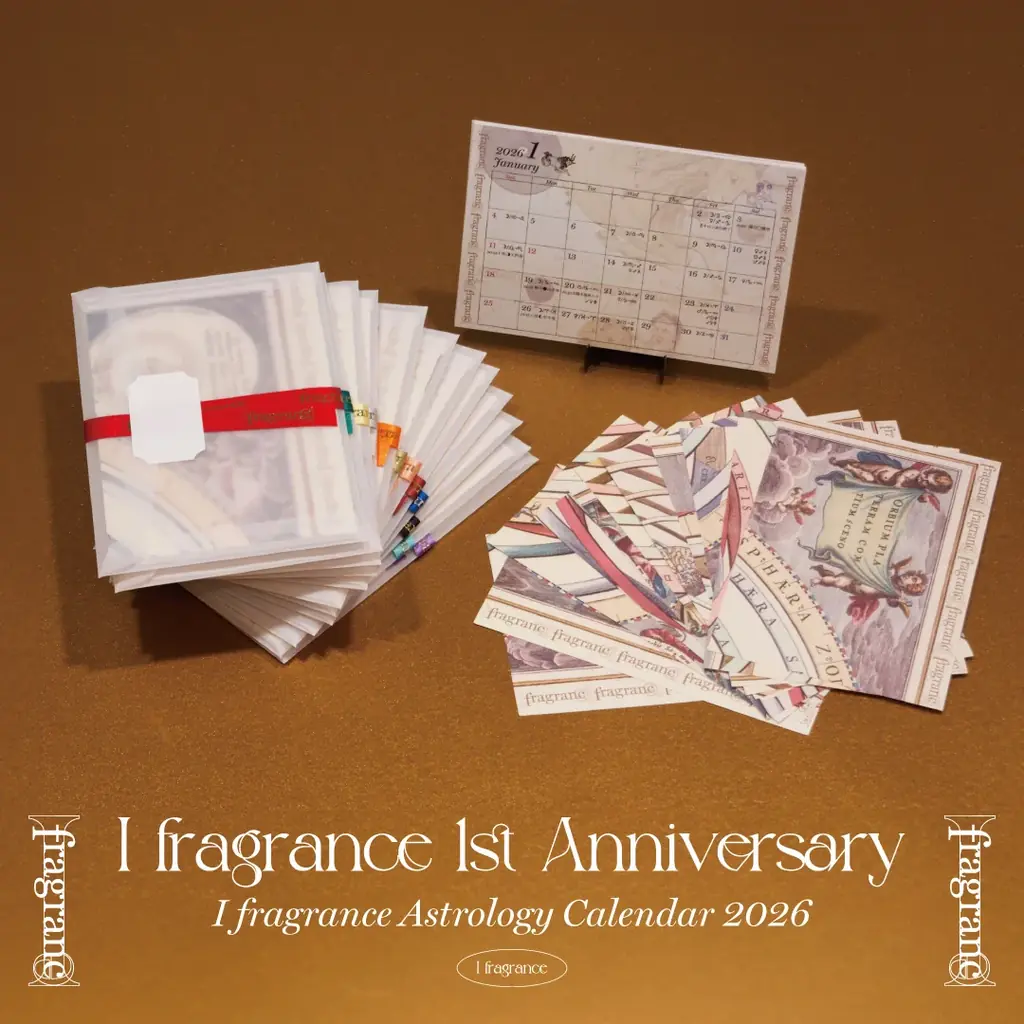 I fragranceの購入者には、2026年占星術カレンダー《I fragrance Astrology Calendar 2026》を1個ノベルティとして提供します。本カレンダーは2026年の星の流れを美しくまとめたオリジナルデザインで、裏面の12枚を並べるとひとつの絵が完成するアート仕様です。