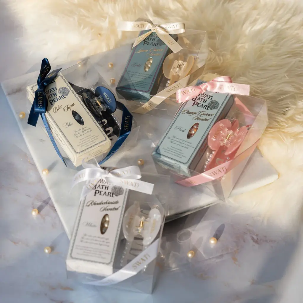 来月の一般発売に先駆けて、POPUP期間中のみ先行販売されるセットです。内容は、SNSで人気のパールモチーフの入浴料「SWATi BATH PEARL(S)」と、ブランドディレクターが細部までこだわったオリジナルのヘアバンスクリップを、リボン付きのBOXにセットした限定BOXで、全4種の展開となります。