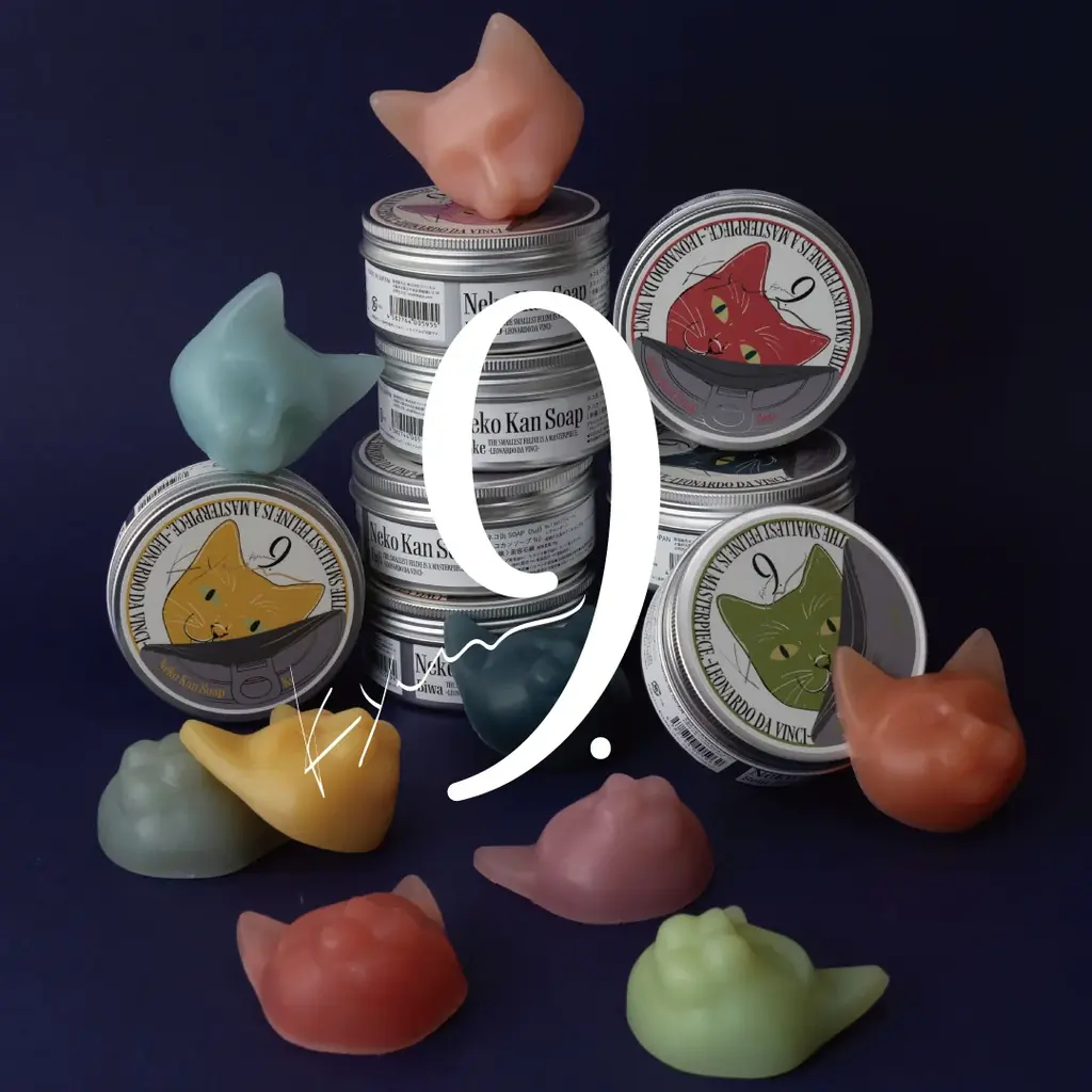9.kyuuの対象商品購入者には、ネコ缶SOAP購入で「ガチャガチャ無料チャレンジ」が付帯します。ネコ缶SOAPのミニチュアは、モチーフの猫だけでなく包み紙やアルミ缶パッケージの細部まで高い再現度で作られており、実物と並べて撮影しても見分けがつかないほどのクオリティが特徴です。