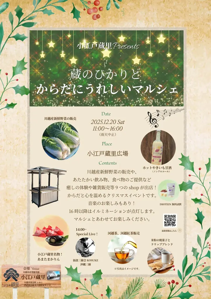 マルシェでは川越産の冬野菜、河越茶、ホット甘酒各種、小江戸蔵里オリジナル銘菓「あまたまかりん」の販売のほか、心を癒す雑貨や書籍の販売が予定されています。当日は明るい時間帯からイルミネーションを点灯し、昼夜を通じて蔵の光を楽しめる構成です。最新情報は小江戸蔵里のInstagram(https://www.instagram.com/koedo_kurari/)で案内されます。