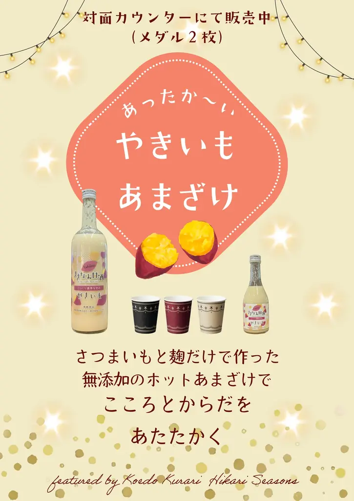 「小江戸蔵里 Hikari Seasons」コラボメニューの第一弾として、ききざけ処昭和蔵より「やきいも甘酒」(ノンアルコール)が提供されます。こちらは砂糖不使用で、麹とさつまいもだけで作られた甘酒です。冷えた体を芯から温めることを意図したメニューです。