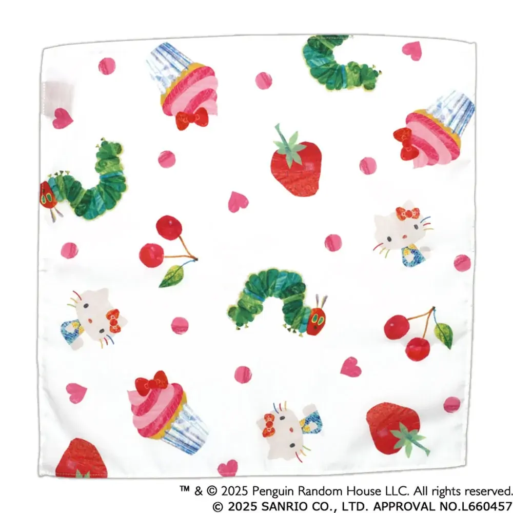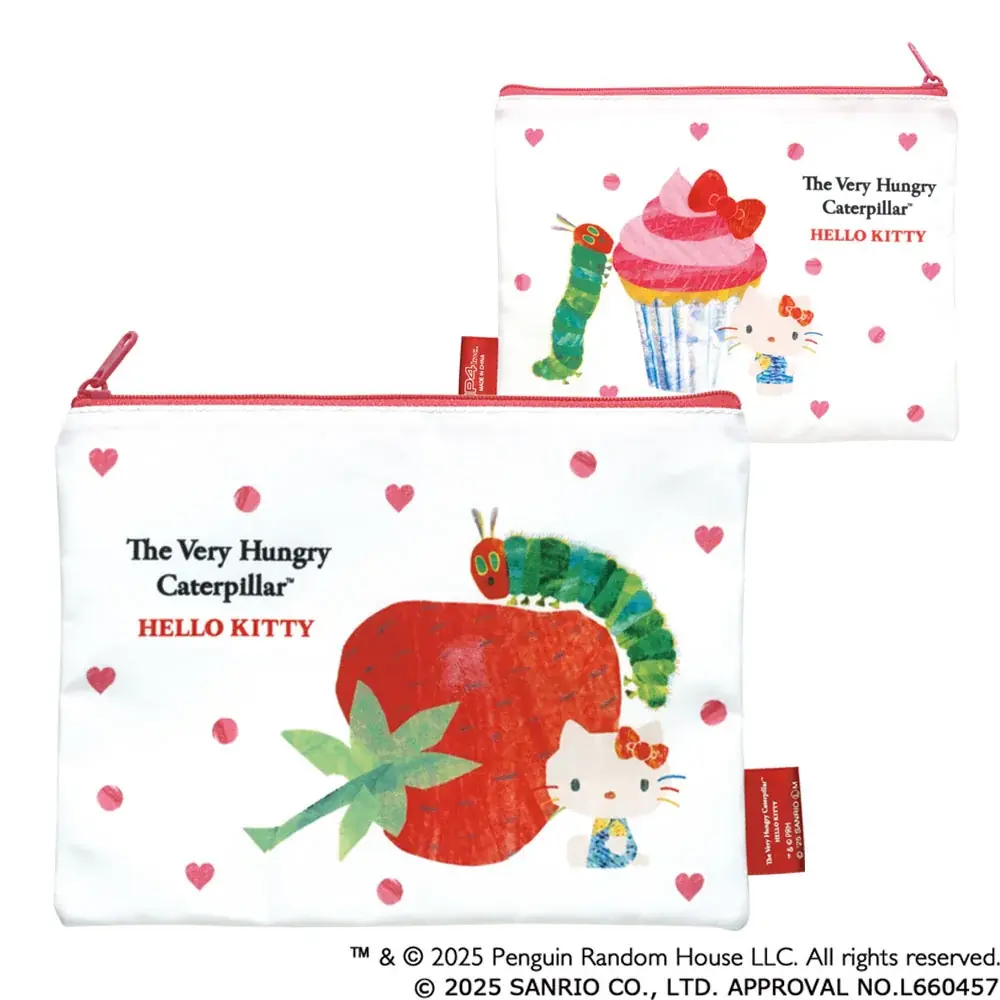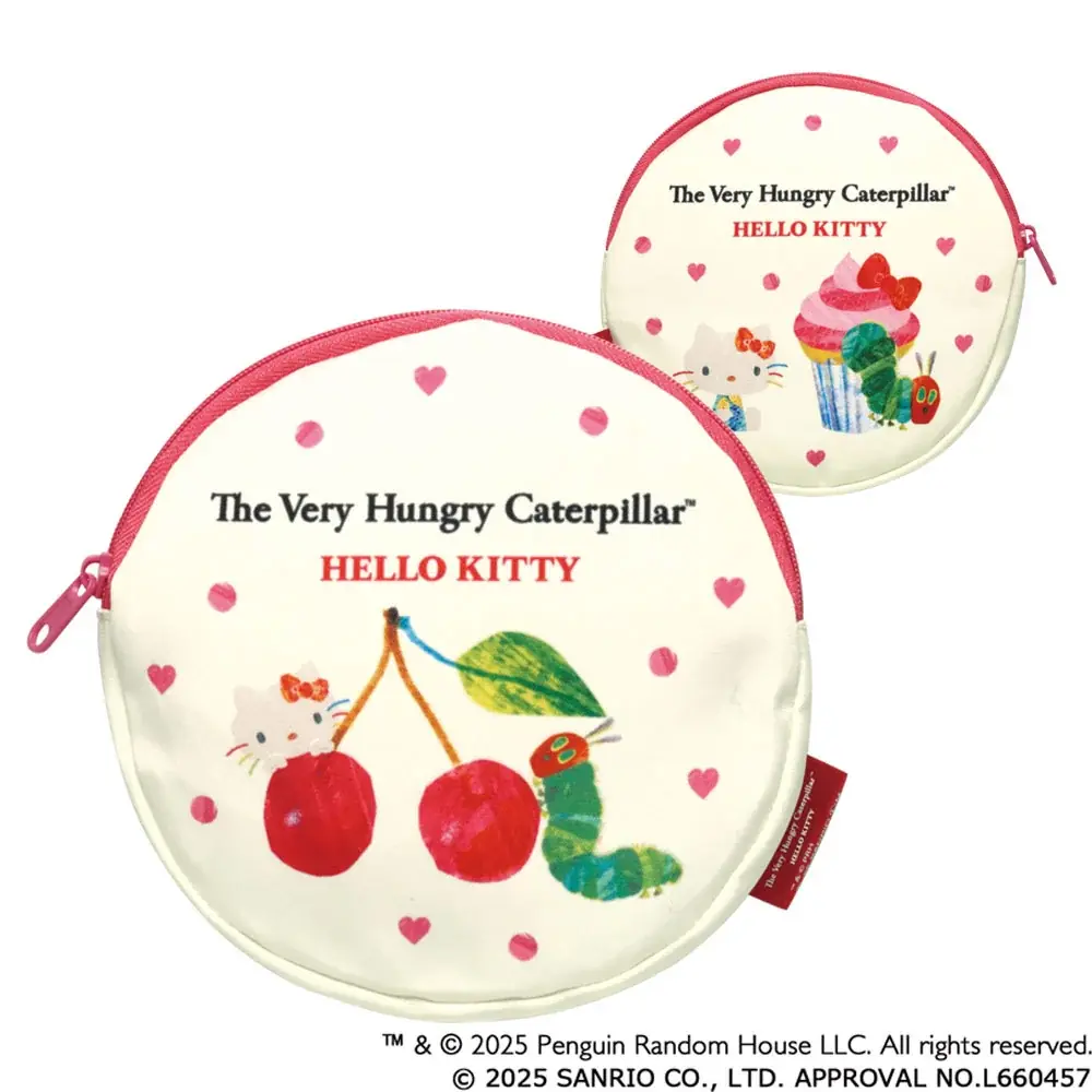 はらぺこあおむしがカップケーキを食べようとする仕草や、ハローキティがエリック・カールの色彩で表現される点がコラボレーションならではの見どころになっています。どちらのキャラクターファンにも訴求する意匠で、持ち歩きやすい雑貨として日常に取り入れやすいデザインに仕上がっています。