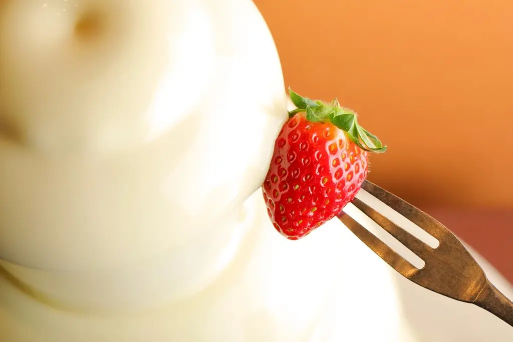 ホワイトチョコレートファウンテンは今回が初登場の目玉で、苺や他の果実を絡めることで味わいと見た目の両方を楽しめます。なお、仕入れ状況により一部メニューが変更になる場合があります。