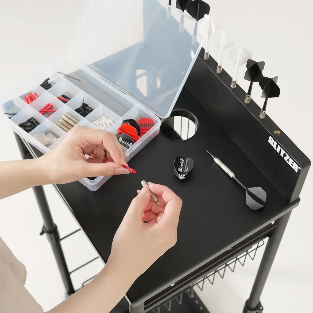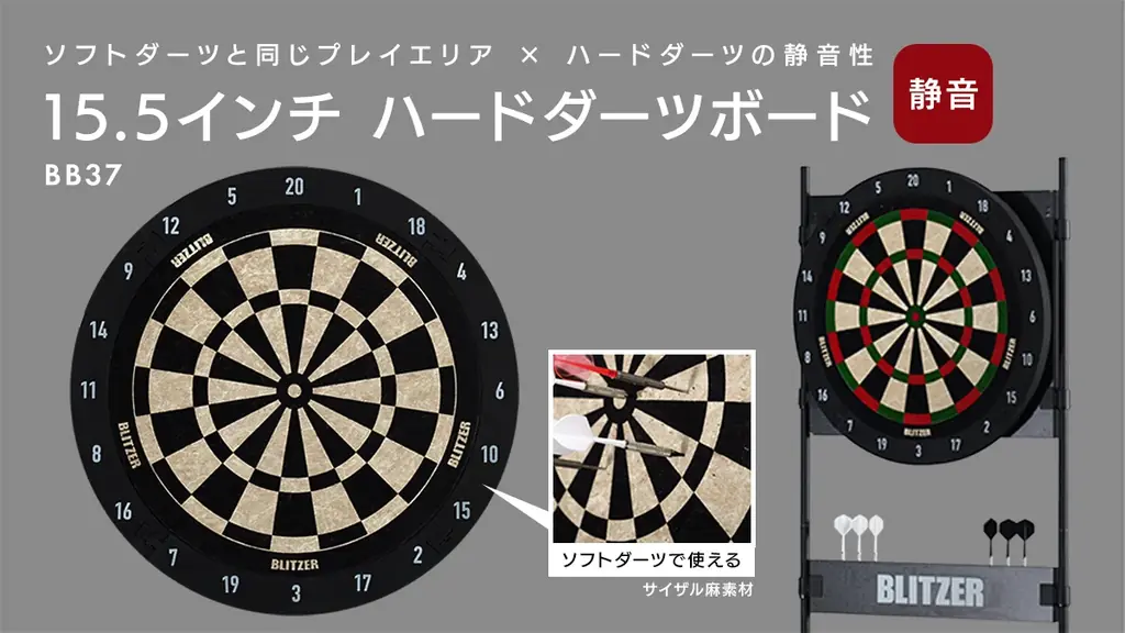 BLITZER®(ブリッツァー)はビーズ株式会社の自社ブランドで、ダーツボードのほかダーツスタンド・ダーツマットなど多数の関連アイテムを展開しています。自由な組み合わせで自宅のダーツ環境を構築できる点をブランドの特徴としています。