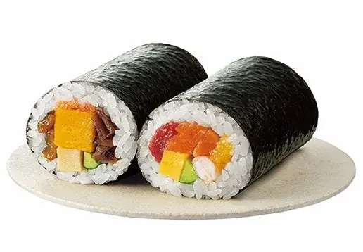 | 2種の恵方巻(恵方巻・海鮮恵方巻) | 973円 / 1,050円 | 全国 | 恵方巻:長さ9cm×直径4.5cm、海鮮:長さ9cm×直径4.7cm | 恵方巻(玉子焼、高野豆腐、穴子、かんぴょう煮、椎茸煮、きゅうり、おぼろ)、海鮮恵方巻(漬けサーモン、まぐろたたき身、玉子焼、海老、きゅうり、数の子) |
