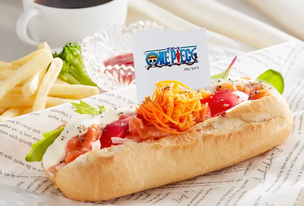 | ニコ・ロビンのハナやかモッツァレラサーモンサンド(ドリンクバー付) | 969円(税込1,065円) 単品:869円(税込955円) | ハナハナの実をイメージしたドッグサンド。サーモンと彩り豊かな食材で「華やかさ」を表現。ロビンの好むコーヒーと相性がよい。 |