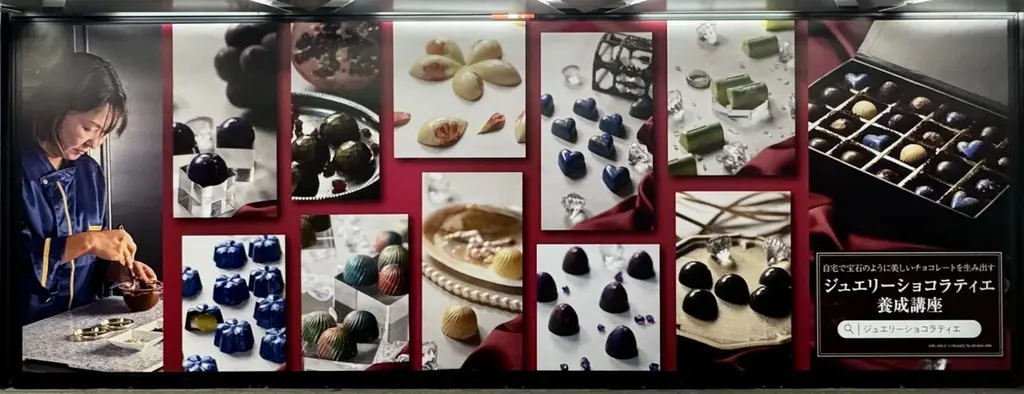 掲出されるビジュアルは、本講座を監修するショコラティエ・坂田彩子先生が制作した、まさに「食べる宝石」と呼べるボンボンショコラ群です。光を受けてきらめく色彩や装飾は、ただ甘いだけでなく冬の街にやわらかな温もりを添えます。通勤や買い物の合間にふと目を留めた人が、気持ちを切り替えるきっかけになるようにとの意図で掲出されます。