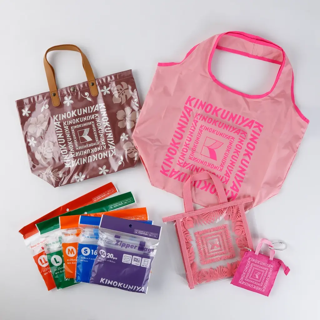 このセットはピンク系で統一されたエコバッグや保冷バッグ、スライドジッパーバッグなどを中心に詰め合わせたものです。デイリーに使いやすいモンステラ柄のクリアトートやコンパクトバッグなどが含まれており、毎日のお買い物からちょっとしたお出かけまで幅広く対応します。
