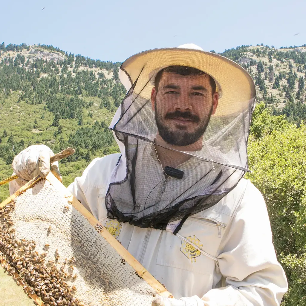 スーカス・ニコラオス氏は養蜂家一家の三代目で、1960年に祖父が始めた養蜂を受け継いでいます。養蜂場は標高2,355メートルのヘルモス山に位置し、「ヘルモス=ヴライコス国立公園」に指定された自然環境の中で多種のはちみつを生産しています。