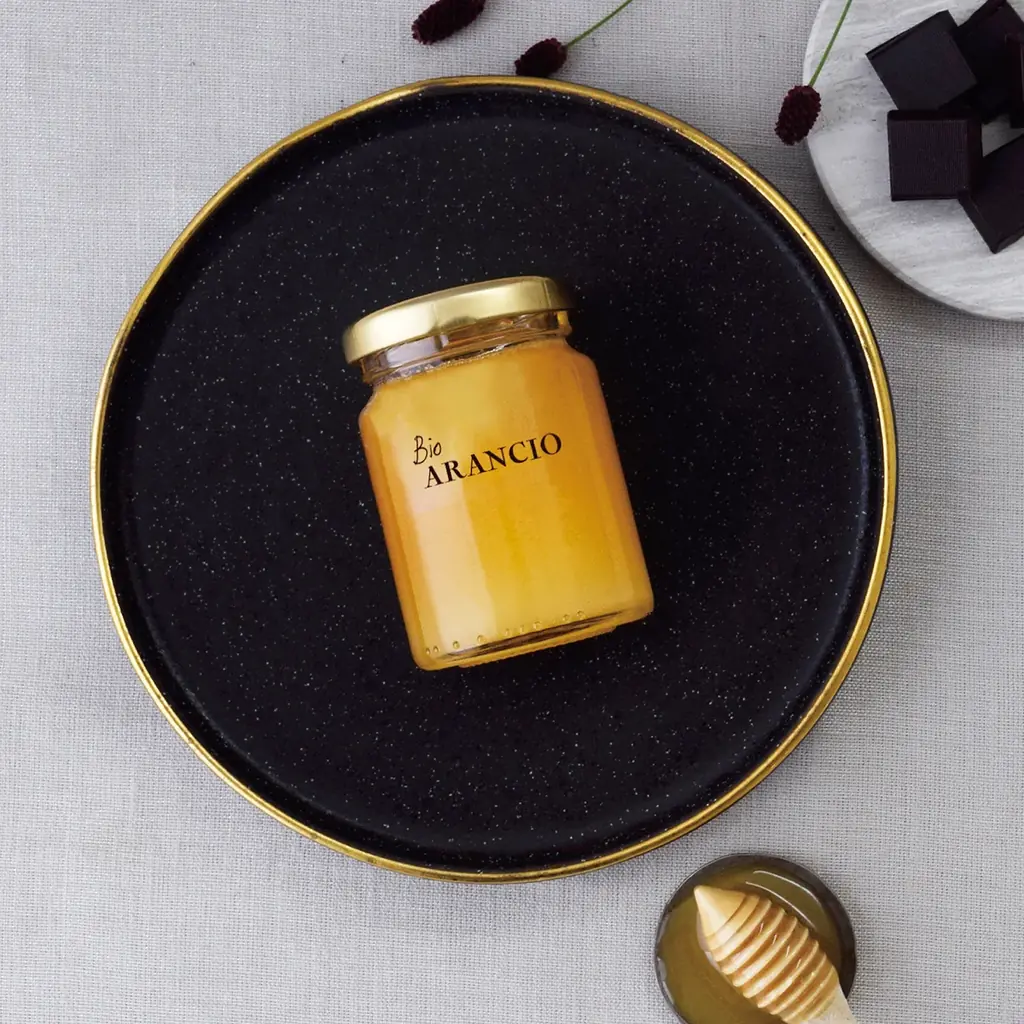 - カラブリアで採れたオレンジはちみつ。凝縮した甘みとフルーティーなシャーベット感があり、トーストやヨーグルト、紅茶に合わせると柑橘らしいさわやかさが際立つ。