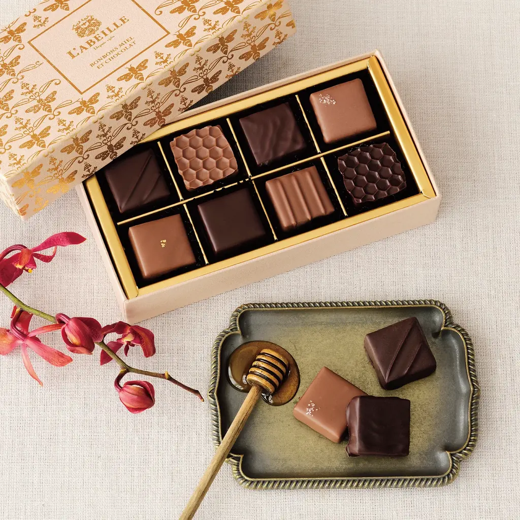 - ラベイユハニーを贅沢に閉じ込めたオリジナルボンボンショコラ。余計な素材を加えないガナッシュで、はちみつの華やかな香りやほろ苦さなど個性が際立つ。