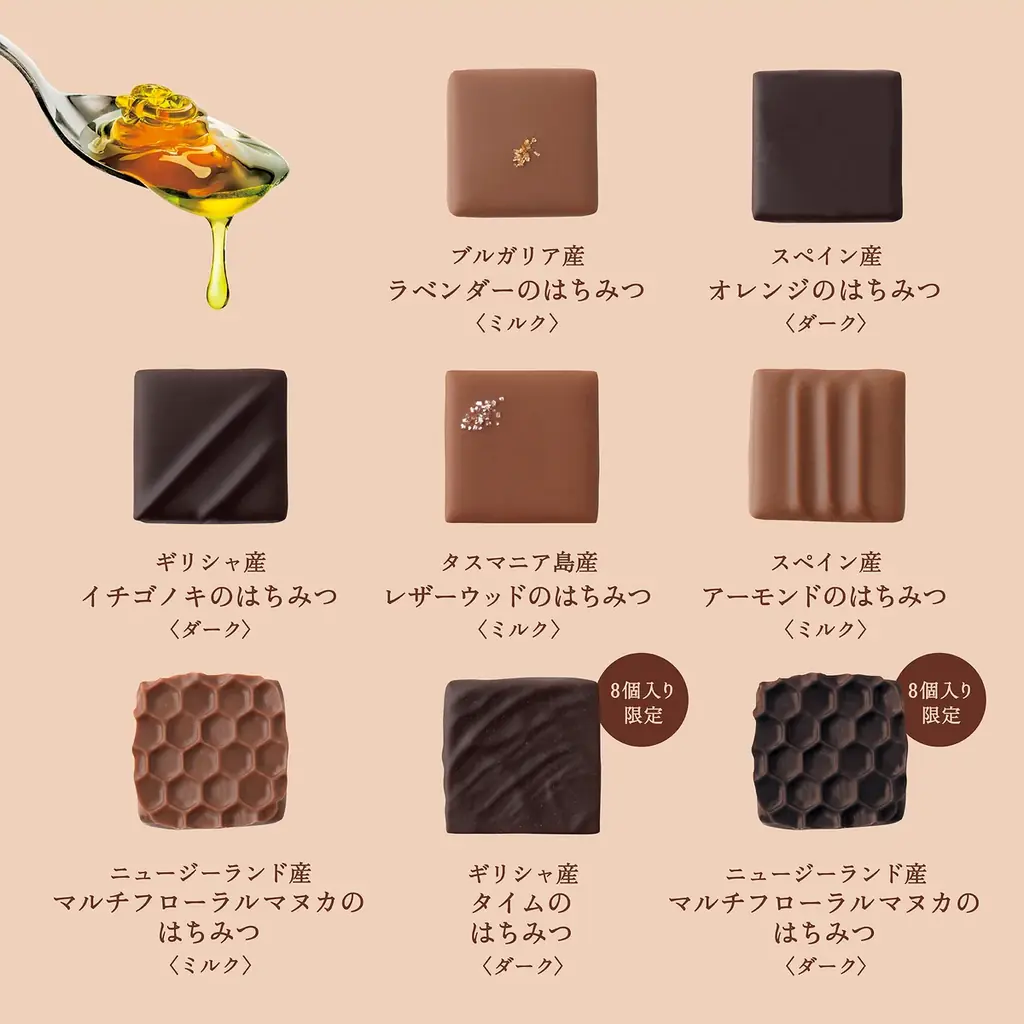 | はちみつボンボンショコラ(8個入) | 4,212円 | 2026/1/14~(数量限定) | 8種構成、マヌカ・ダークなどニュアンスの異なるはちみつを使用 |