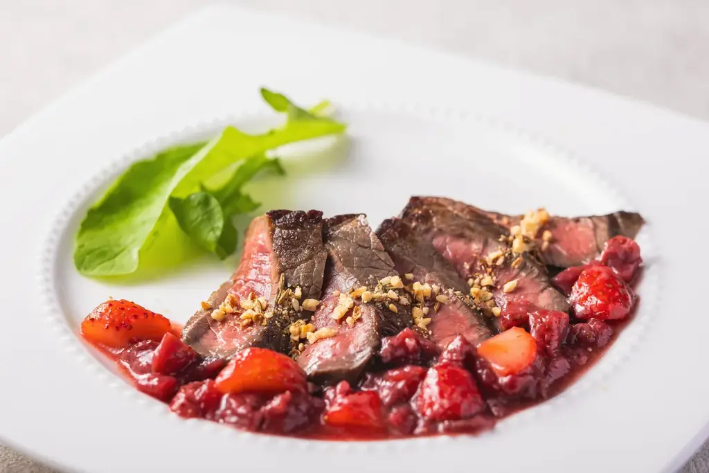 夕食ではライブキッチンでのむなかた牛ステーキに注目のいちごソースを添えて提供します。シェフが目の前で焼き上げるむなかた牛の旨味に、赤ワインベースの甘酸っぱい「いちごソース」が合わせられます。