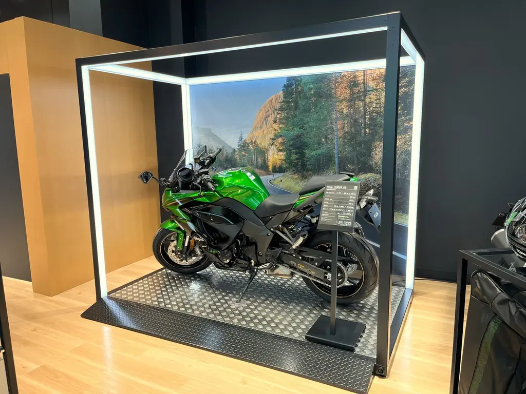 このケージ状の展示はカワサキプラザのアイコニックポイントの一つであり、来場者が車両をひと目で認識できるビジュアルとなっています。展示物の保護と演出の両立を図るデザインです。