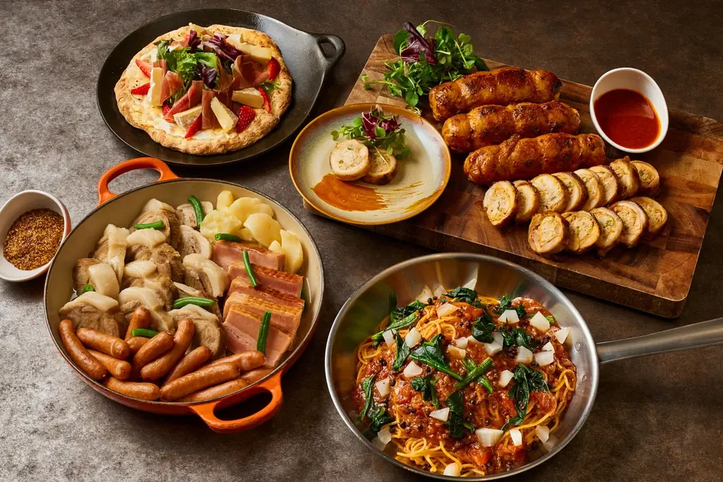 月替わりのライブキッチンメニューおよび代表的なピンサ、パスタ、メインは以下の通りです。表記はプレスリリースの情報を忠実に再現しています。