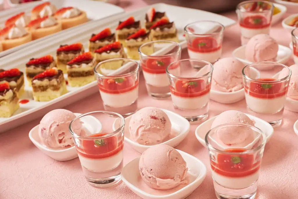 いちごスイーツは、トッピングを楽しめるオリジナルパフェや焼きたてパンケーキ、デザートピンサ、ゼリー、アイスクリーム、和スイーツなど、多彩なデザートが並びます。これらはブッフェ形式で自由に選べます。