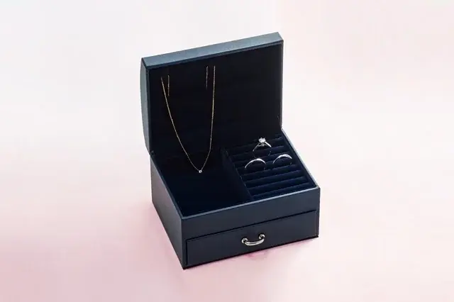 ダイヤモンドルースをご成約された方に、ネックレス用フックや引き出し付きの収納力あるジュエリーボックスを進呈します。ネイビーのレザー調でシルバー金具をあしらったシックな仕様です。