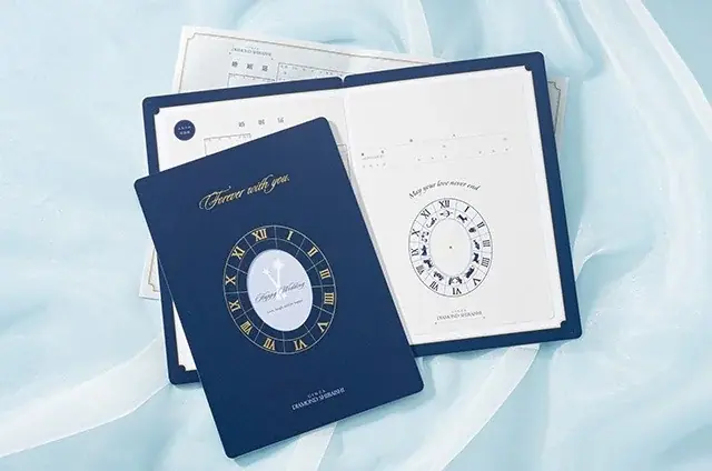 銀座本店のシンボルである時計をモチーフにした婚姻届を提供。提出用と保管用があり、保管用には写真を貼れる仕様です。内側には星座が散りばめられた時計のイラストが描かれており、リングを置いての撮影にも適しています。