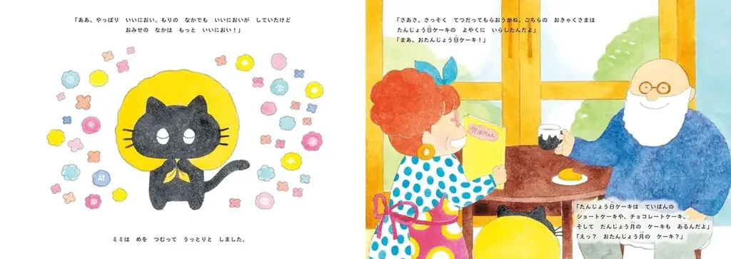 物語の中では、ムムさんの特製「おたんじょう月のケーキ」をめぐるやりとりが描かれ、ミミがその説明にうっとりする場面や、ムムさんが「よーし ミミのときは とびきりの ケーキを やいてあげよう。たんじょう日は いつなんだい?」と尋ねる会話などが収められています。コンドウアキ氏の作風が凝縮されており、子どもだけでなく大人にも響く絵本です。
