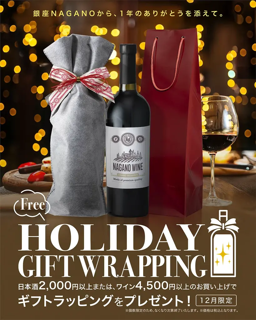 銀座NAGANOでは12月中限定で、日本酒またはワインの購入者を対象にホリデー仕様の無料ギフトラッピングキャンペーンを実施します。対象期間は2025年12月中で、個数限定のためなくなり次第終了となります。
