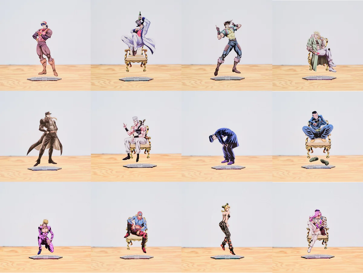 今回公開された描きおろし等身イラストは、アニメ『ジョジョの奇妙な冒険』各シリーズの登場人物12名が椅子に腰をかけた姿を描いた新ビジュアルです。登場キャラクターはジョナサン・ジョースター、ウィル・A・ツェペリ、ジョセフ・ジョースター、シーザー・A・ツェペリ、空条承太郎、ジャン・ピエール・ポルナレフ、東方仗助、虹村億泰、ジョルノ・ジョバァーナ、グイード・ミスタ、空条徐倫、ナルシソ・アナスイの全12名です。
