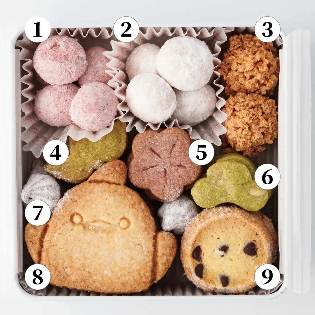 | 内容 | スノーボール(いちご・ノーマル)、ココナッツサブレロシェ、緑茶クッキー(竹)、いちごサブレ(梅)、緑茶とホワイトチョコチップクッキー(松)、焼きショコラ、塩バターサブレ、ディアマン(チョコチップ) 計9種 |