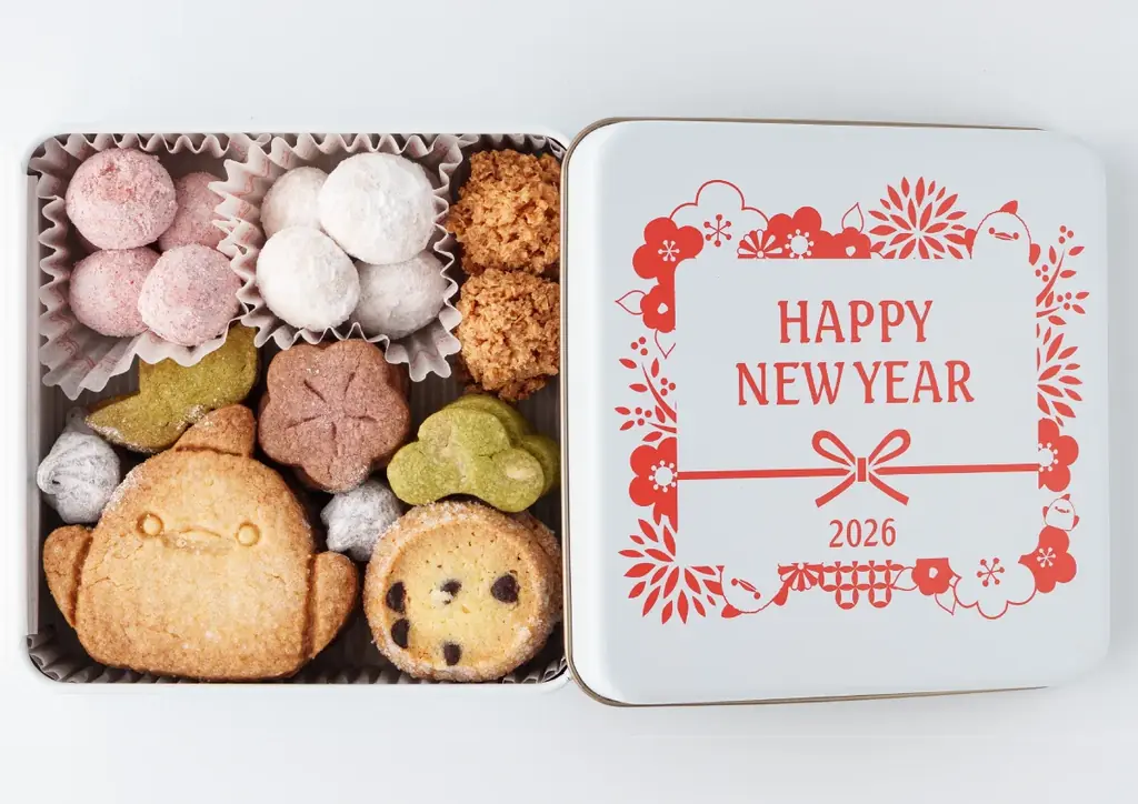 本件は、年末年始の贈答や帰省土産として想定された季節限定商品で、白地の缶に紅色の梅や松などをあしらった華やかなデザインを採用しています。中身だけでなく缶自体も小物入れやインテリアとして利用できる特別仕様です。