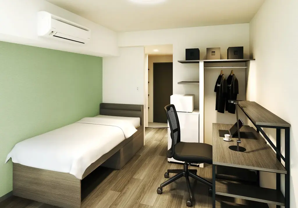 全179室の居室は、洋室14.07~19.5㎡の単身向けサイズで設計されている。リノベーションにより、一般的な学生寮より独立性の高い居室を実現し、入居初日から生活を始められるよう生活家電を完備している。