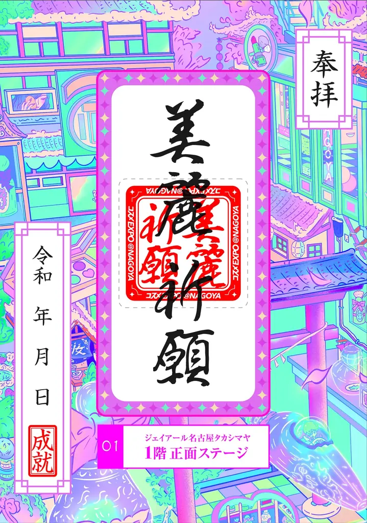 百貨店側のステージでは京都の河合神社オリジナルの絵馬に見立てた手鏡型短冊を用いた美麗祈願が行えます。イベント終了後、河合神社へ奉納する運びとなっており、来場者の祈願は一定の形式で取りまとめられます。なお、手鏡型短冊は河合神社の鏡絵馬を模したものであり、絵馬そのものではありません。