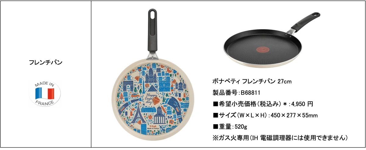 今回のキャンペーンで複数の賞品に採用されている「ボナペティ フレンチパン 27cm」は、クレープやガレットを家庭で手軽に作ることを想定した設計です。製品の特長は下記の通りです。