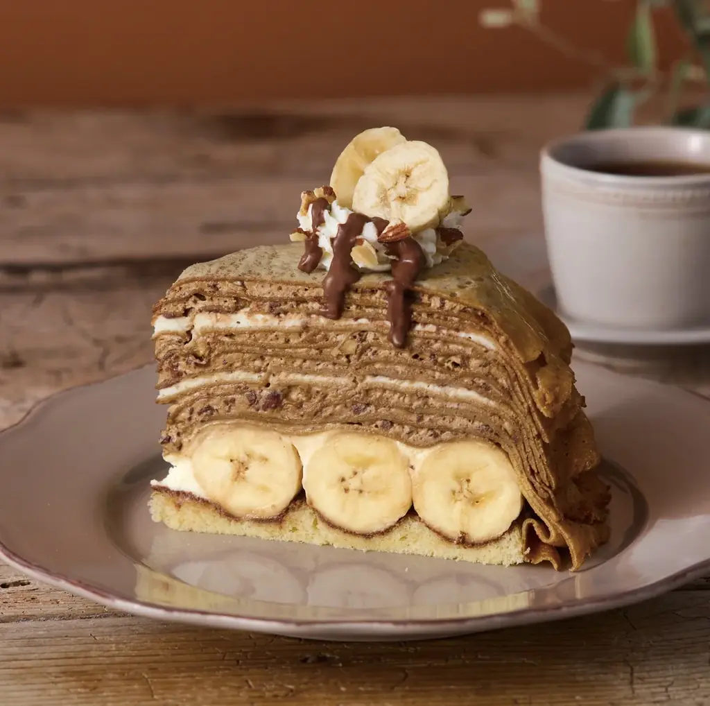 新作のアーモンドモカクリームとバナナのミルクレープは、コーヒーの風味とバナナの甘さ、ラム酒を加えたカスタードの香りが層となって広がる構成です。自家製クレープ生地のもちもち感を生かしたシグネチャーメニューの一つとして位置づけられています。