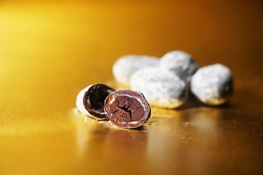 本商品の特徴は二層構造です。中心には焙煎を行わないローカカオのまるごとした粒を置き、まずブラジル産のオーガニックきび糖で糖衣を施します。その糖衣を覆うように、ダンデライオン・チョコレートのシングルオリジン「セムリキ・フォレスト, ウガンダ 70%」をコーティングすることで、重層感のある一粒に仕上げています。