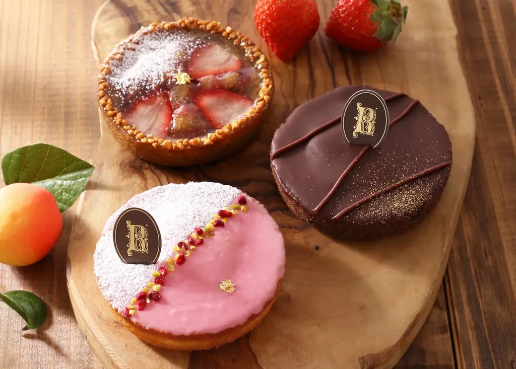 発酵バターの風味豊かな生地を基本に、ショコラや苺、アプリコット、フランボワーズなどをあしらった〈アプリコット・フランボワーズ〉、〈苺と紅茶〉、〈ザッハ〉の3種が用意されています。お手土産にも適したサイズ感です。