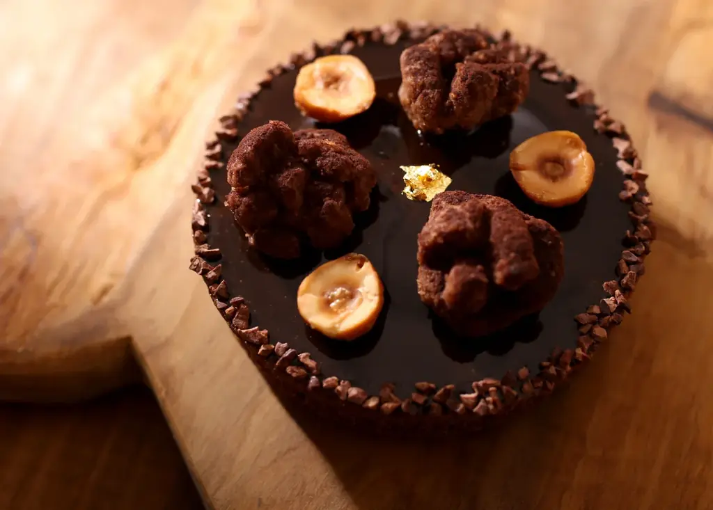 数量限定販売のガトー・ナンテ〈ショコラリュクス〉は、コニャック V.S.O.P. の風味が特徴の濃厚ショコラ生地にショコラのグラサージュやシュトロイゼルを施し、ヘーゼルナッツとカカオニブでアクセントをつけた贅沢な一品です。