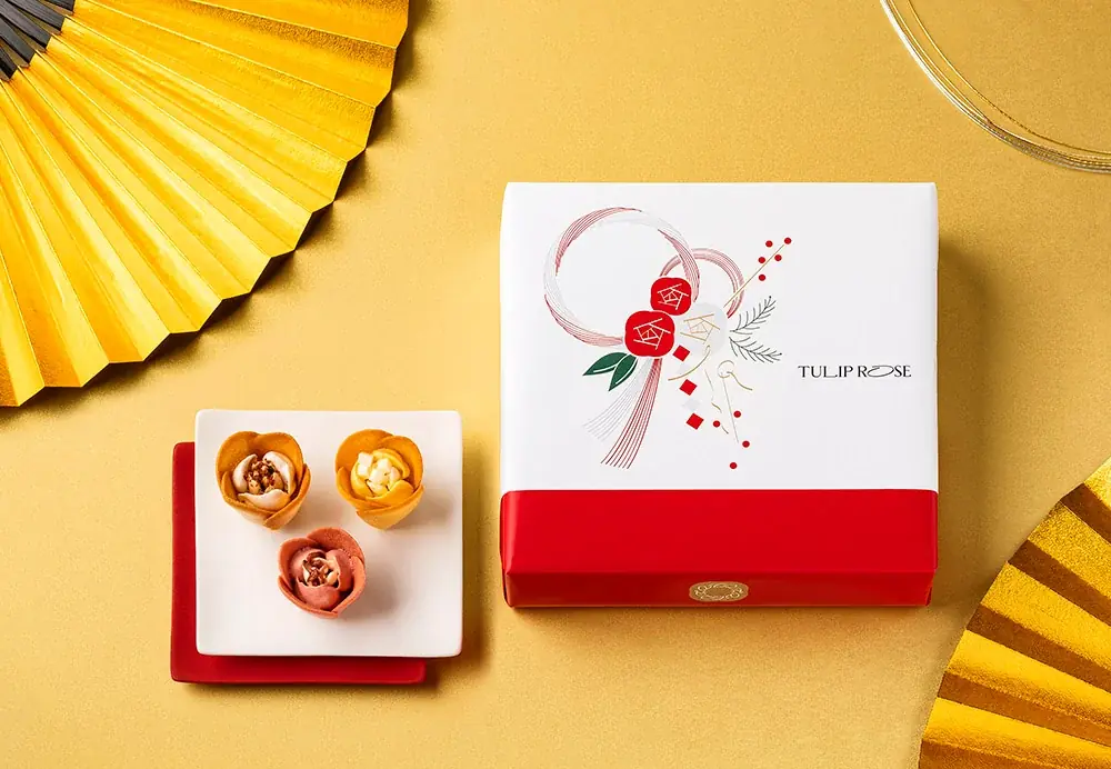 この商品は、香ばしいチューリップ形のラングドシャクッキーの“花びら”の中に、とろけるようなショコラクリームの“ローズ”が咲くという、ブランドならではのフラワースイーツです。紅白を基調としたお正月らしいデザインで、新年のご挨拶や贈り物に適した詰合せになっています。