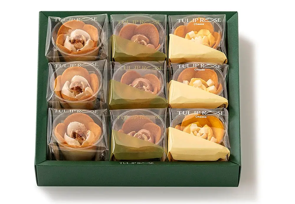 本詰合せには、ブランドの代表作である「チューリップローズ」の定番と季節限定の味がバランスよく含まれます。花をモチーフにした見た目と、素材の香りや食感にこだわったクリームが特長です。