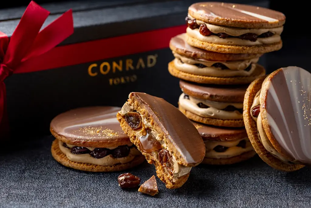 レーズンサンドはコンラッド東京のオリジナルスイーツとして、ペストリーシェフ魚住が手掛ける商品です。素材や製法にこだわり、サブレのサクサク食感とクリームやソースのハーモニーを追求しています。2月は「コーヒーレーズンサンド」を、3月は「オリジナルレーズンサンド」を提供します。