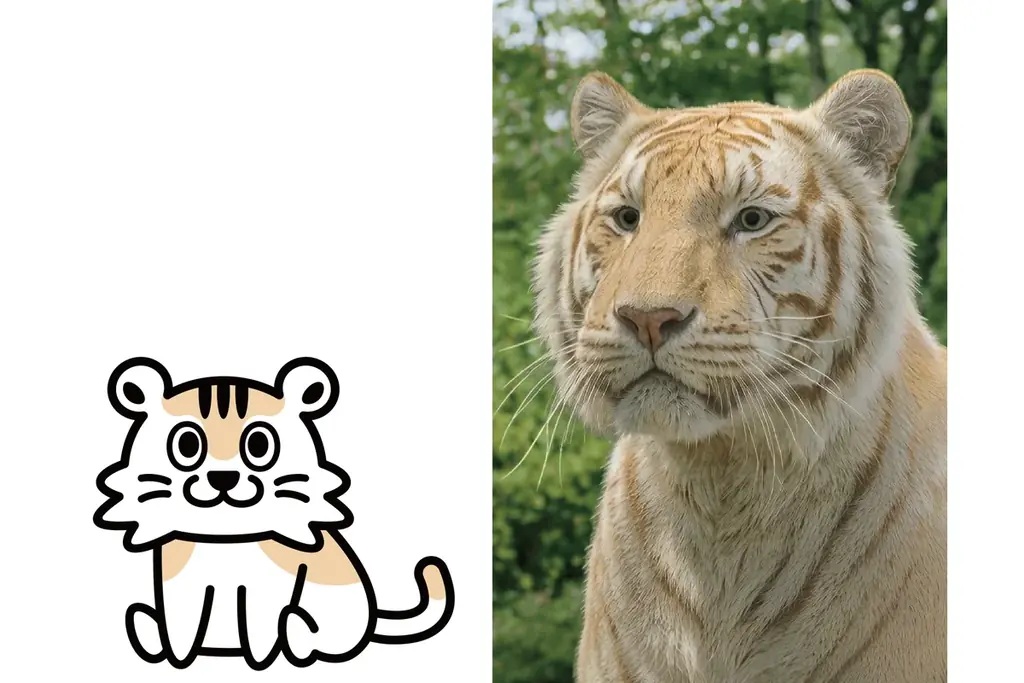 虎雄は、世界に約30頭ほどしかいないとされる「金色の毛並み」を有する希少なゴールデンタビータイガー(別名:ストロベリータイガー)をモデルにしたキャラクターです。設定では、虎雄は元々トラではなかったが、愛する彼女が口にする存在「森トラ」に嫉妬した結果、いつしか本物の虎になってしまったという物語性を持ちます。虎雄は「俺こそが森トラであり、名も体も虎なのだ」と思うほどの自己同一化が描かれます。
