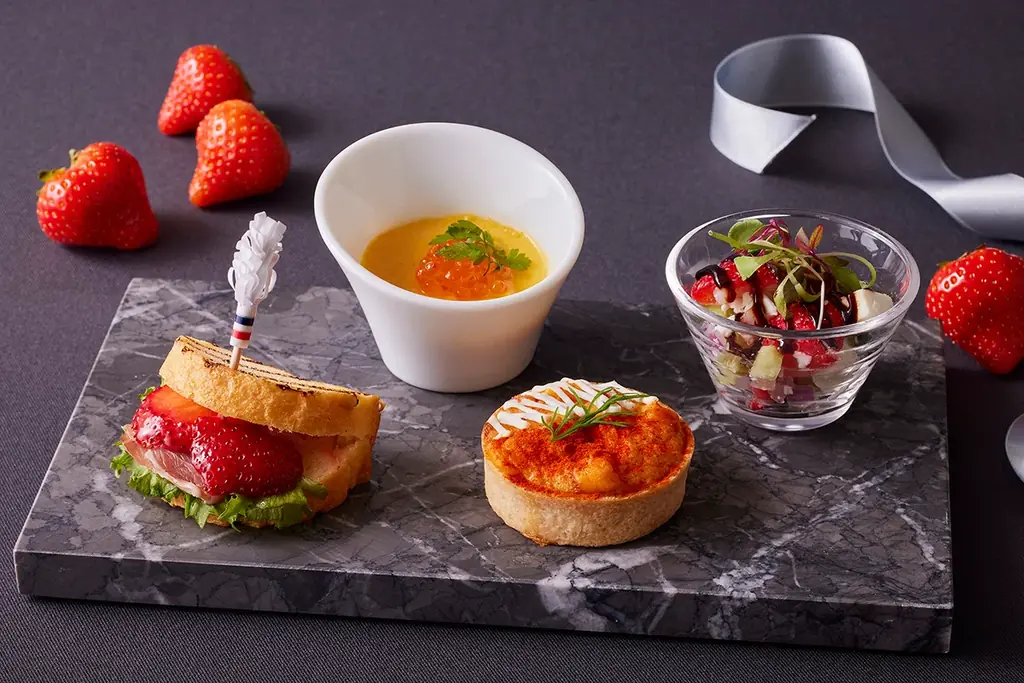 スイーツの甘さを引き立てるセイヴォリーは、いちごを使ったサラダやサンドウィッチのほか、魚介や冬野菜を用いた温かい一品も含まれます。塩味や酸味、旨味のバランスでティータイム全体を調和させる意図です。