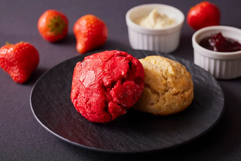 スコーンはプレーンに加え、いちごとチョコレートを組み合わせたものが用意され、スイーツと組み合わせて楽しめます。