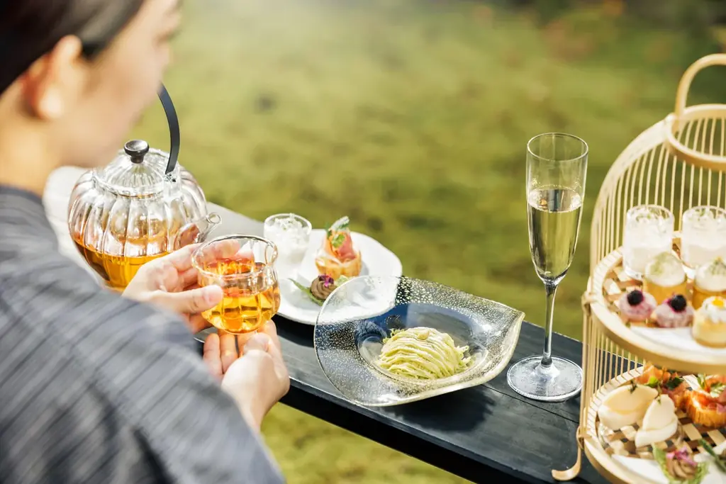日中の体験として、せせらきラウンジでは界 秋保オリジナルの「伊達な茶会アフタヌーンティー」を提供します。提供開始はチェックイン前の14:00からで、他の宿泊客がいない空間でゆったりと過ごせる設定です。