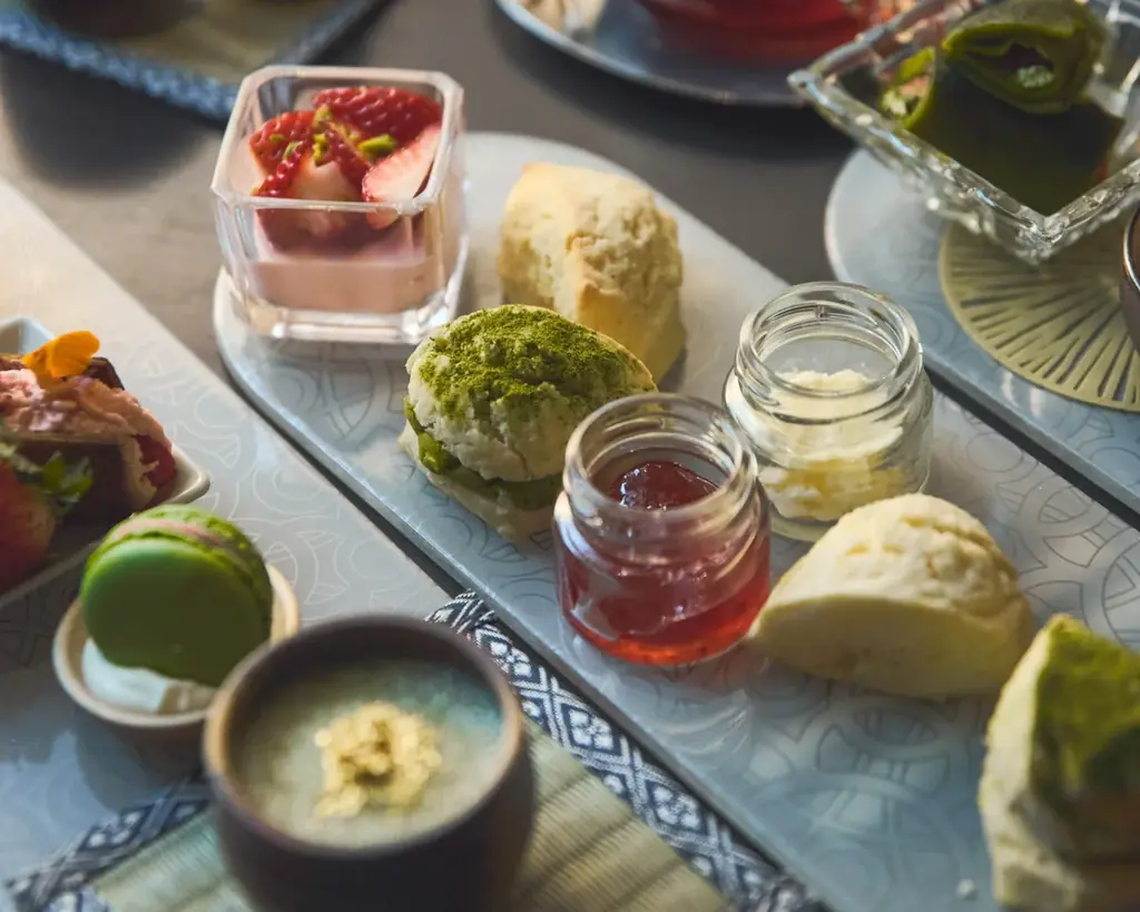 ティースタンドの中心には、抹茶といちごのコントラストが映える多彩なスイーツが並びます。ひとつひとつに素材の特徴を生かした工夫が施されており、和の要素と洋の技法を織り交ぜた構成になっています。