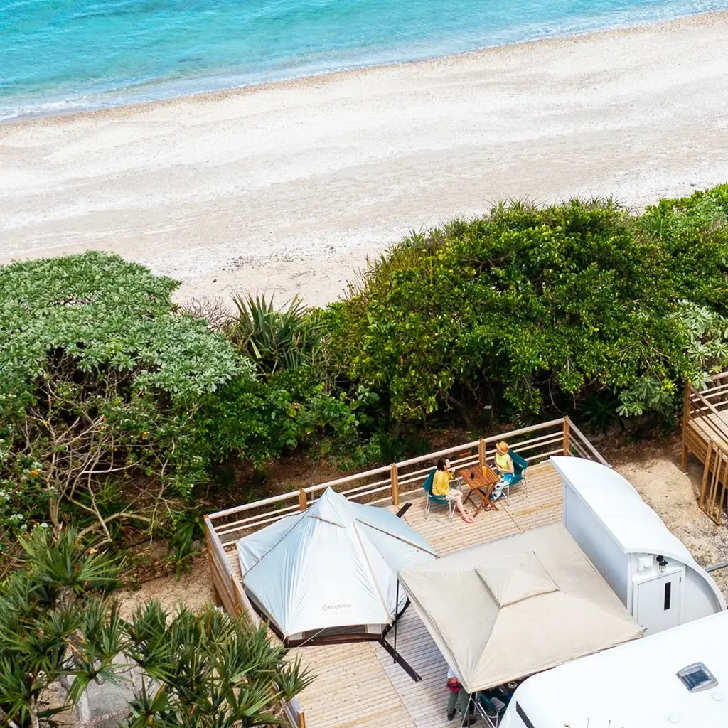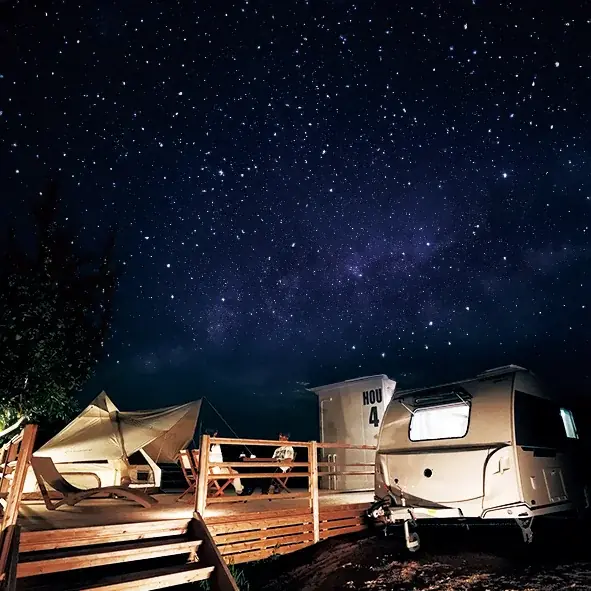 - 本格トレーラーハウスを用いたグランピング宿泊:各部にプライベートウッドデッキを備え、自然に囲まれた滞在が可能。
