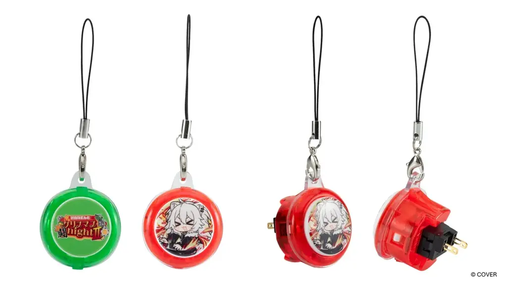商品名は「獅白ぼたんとクリスマス闘night Ⅱ 30Φアケコンボタン(赤 / 緑)」。三和電子製の30φアケコン交換ボタンをベースに、描き下ろしイラストとイベントロゴをあしらった特別デザインです。