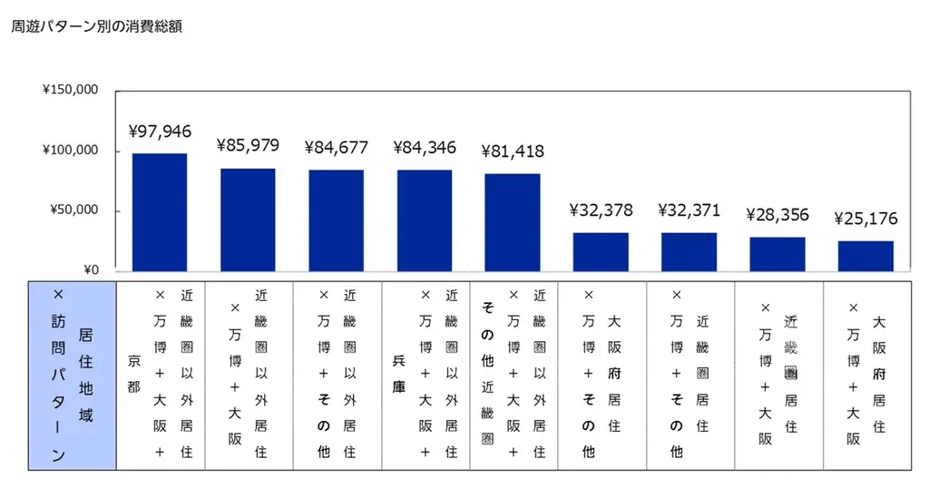 「その他」パターンは、万博+京都+兵庫+奈良など、上記カテゴリに当てはまらない複数地域を周遊したケースを含みます。また「万博のみ訪問」のように万博会場以外の大阪滞在時間が短いパターンも集計内に含まれます。