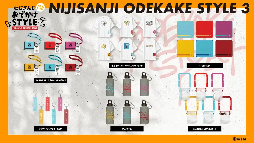 - グッズラインナップ(全6種):名言イラストTシャツ&ステッカーセット、BARI-BARI財布&メッセージカード、クリアボトル、にじぬい&にじぱぺっとポーチ、ハンカチタオル、アクリルスティックキーホルダー