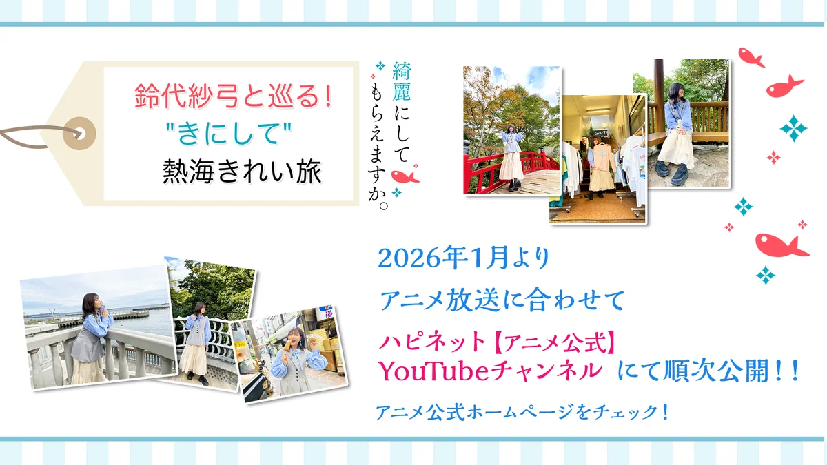 金目綿花奈役の鈴代紗弓さんが出演するシリーズ動画「鈴代紗弓と巡る!”きにして”熱海きれい旅」が公開されます。こちらはハピネット【アニメ公式】YouTubeチャンネルで、アニメ放送に合わせて順次公開される予定です。