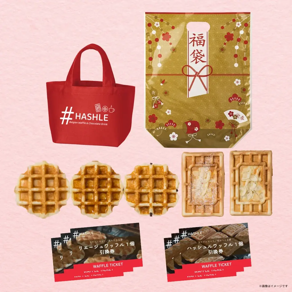| 福わっふる袋 | 2026年1月2日(金)~1月12日(月・祝) ※なくなり次第終了 | 2,500円 | ジョイナステラス 二俣川店/二子玉川 東急フードショー店 | リエージュ(発酵バター、メープル、バトンショコラ)各1、ハッシュル(ふわとろカスタード、なめらかチョコ)各1、リエージュ引換券×3、ハッシュル引換券×3、オリジナルトートバッグ(赤)、手提げ袋 | 購入当日~2026年2月28日(土) |
