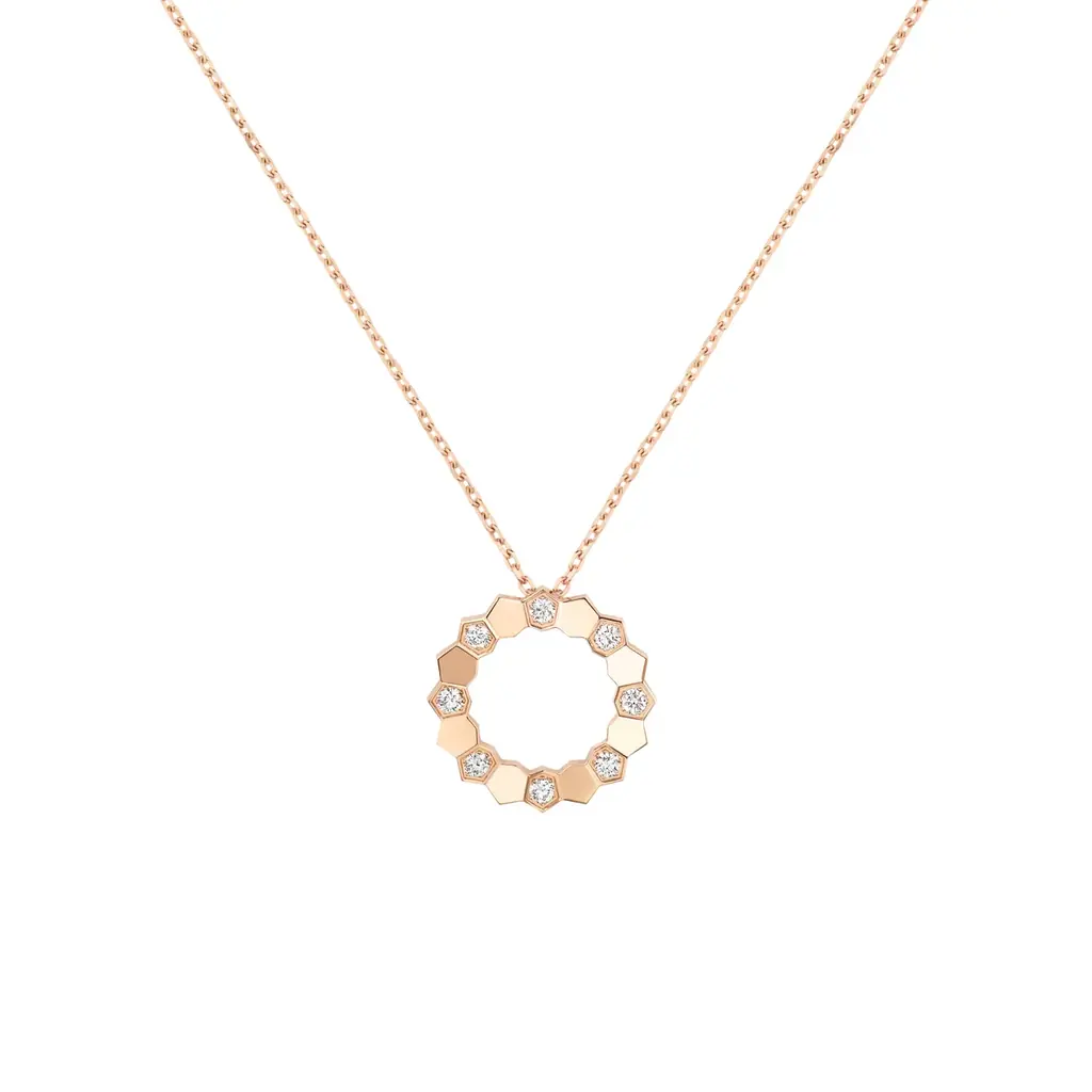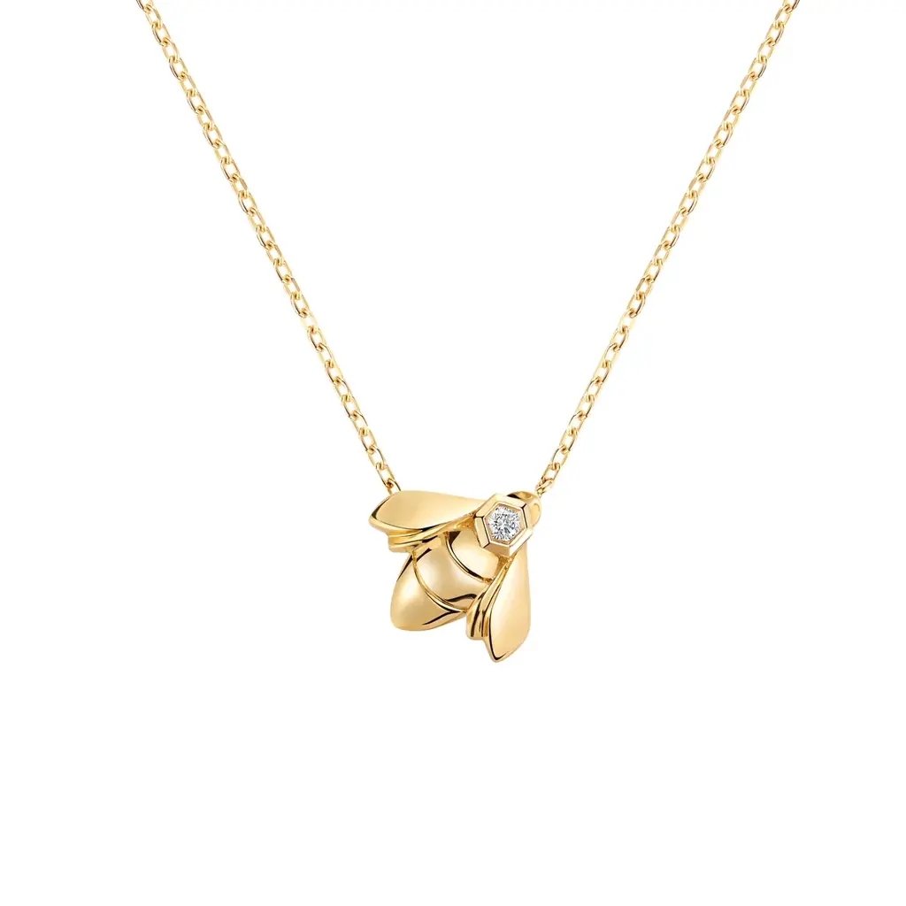 ミツバチやハニカムのモチーフは、知的でありながら愛らしい印象を与え、身に着ける人に幸福をもたらす象徴として胸元で繊細に輝く構成になっている。