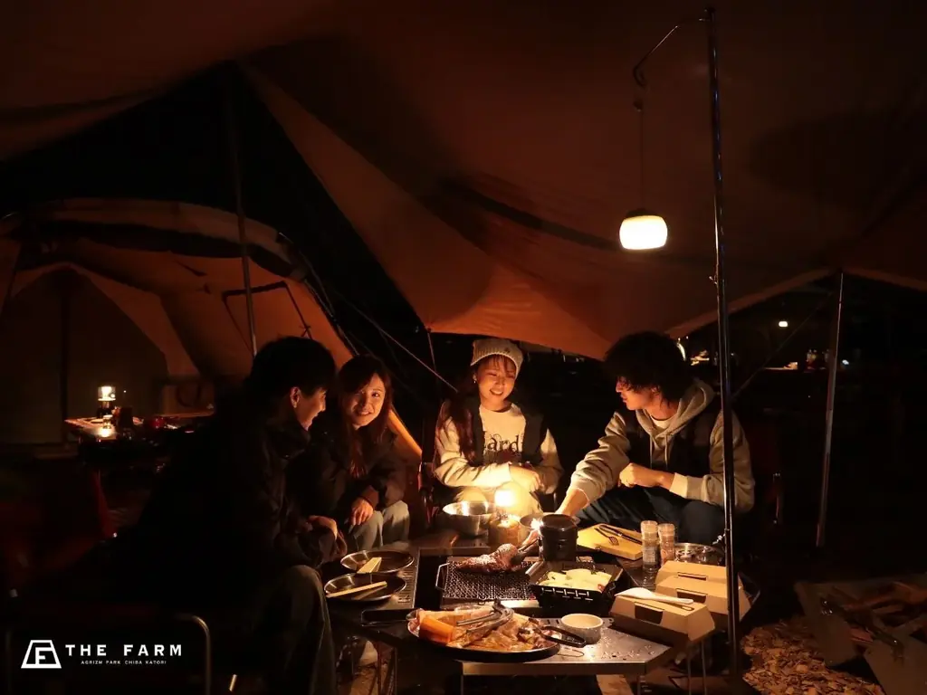 大型テント・タープ、寝袋や暖房など季節に合わせた装備が用意される、食事付きの完全手ぶらプラン。予約はこちら: https://www.nap-camp.com/chiba/13847/plans/20044020?_gl=
